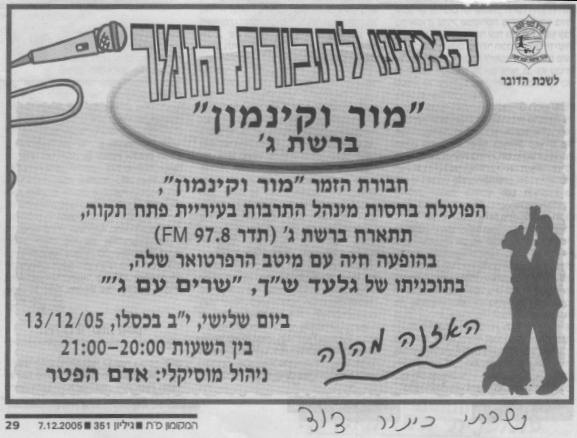 pix:ad02 album:adMc, period:דצמבר 2005 descr:הודעה של רשות השידור על שעת שידור עם להקת מור וקינמון. רחל אפרים שרה כסולנית את 'כינור דוד' |