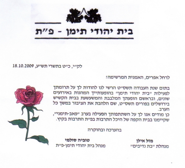 pix:ltr01 album:ltr, period:period descr:מכתב הוקרה מטוביה סולמי - מנהל בית יהודי תימן ומזל אין-מנהלת להקת בת נדיבים |
