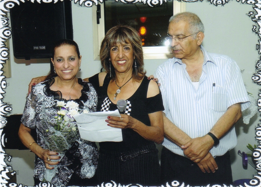 pix:wX02 album:pixBn, period:יוני 2010 descr:רחל מקבלת מכתב הערכה. בצילום עם רחל: מזל אילן-מנהלת הלהקה, וטוביה סולמי-מנהל בית יהודי תימן |